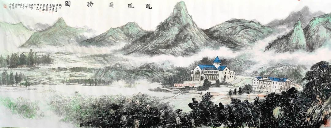 最后,艺术家团队携手为茅台凤凰庄园共创一幅专属画作。他们围坐探讨,将各自的作品元素巧妙融合,最终呈现出一幅《凤凰揽胜图》,其中既有细腻笔触描绘的庄园全景,又有壮丽和谐的产区风光,定格了庄园与周围生态和谐自然的美景,也展示了艺术家们对创作的完美追求。